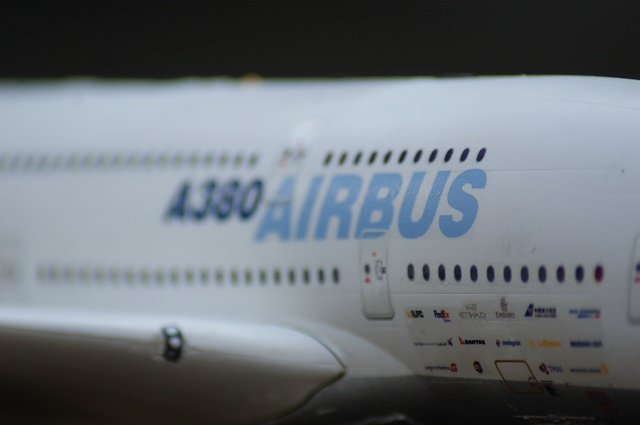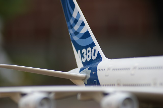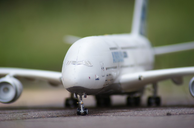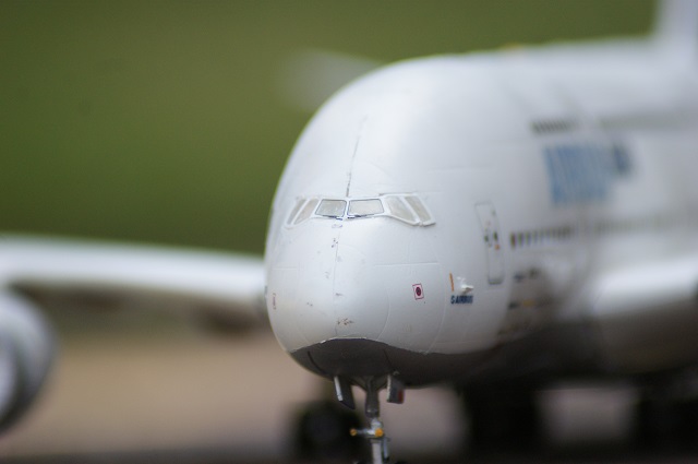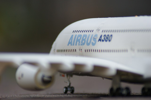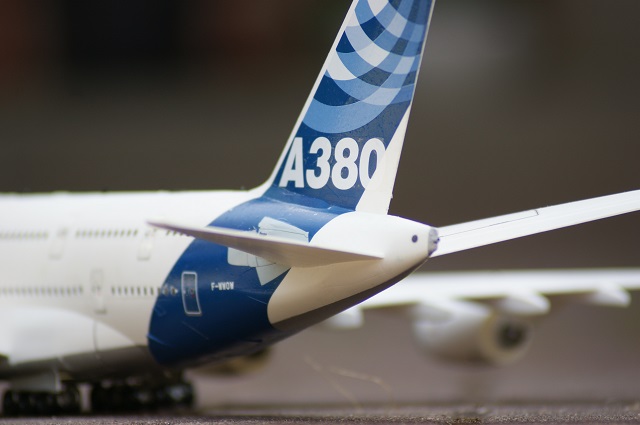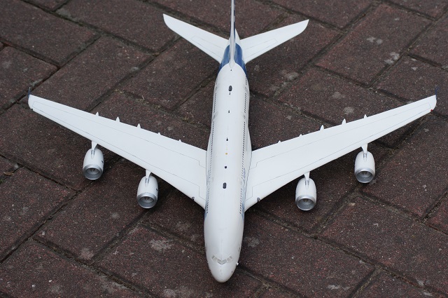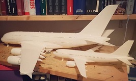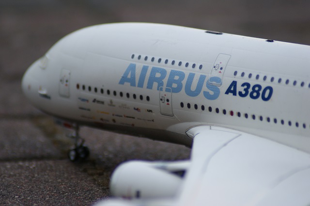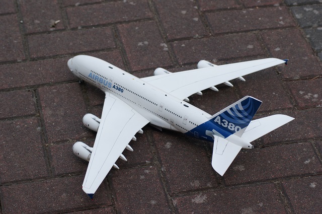 Das Riesenflugzeug Airbus A-380 in der Prototypausführung. Das Modell ist im Maßstab 1:144 und lässt ungefähr erahnen, wie groß dieses Flugzeug in Wirklichkeit ist. Das Modell hat die Abmessungen von 50cm x 55cm. Hier mal im Vergleich zum A-319.