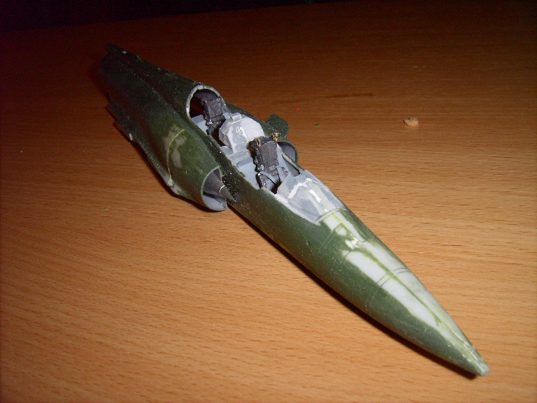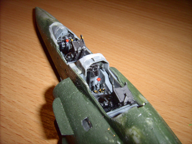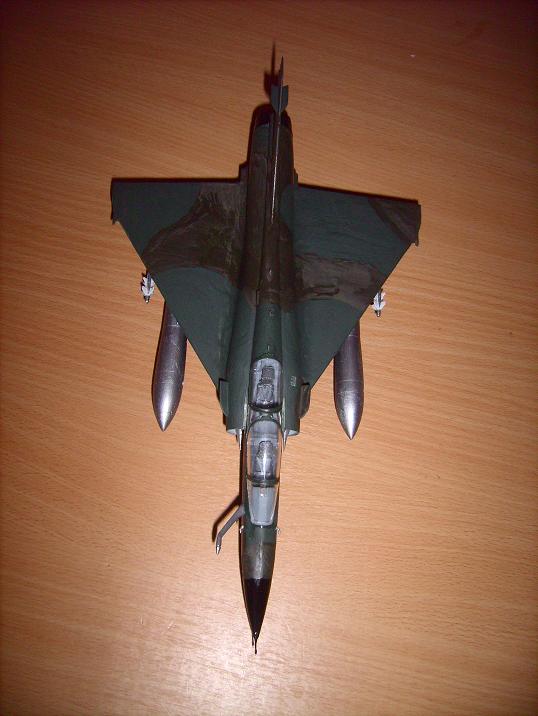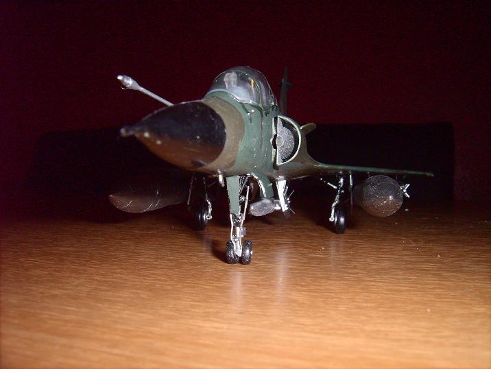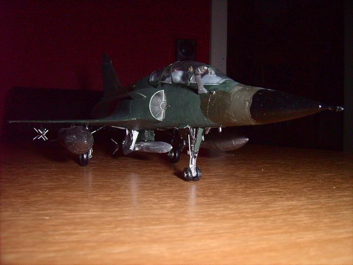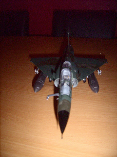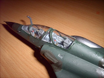 Modell eines nuklearen Tiefflugjagdbombers Mirage 2000. Der Maßstab ist 1:48. Die Maschine wurde von mir ein wenig "gepimt". Das Cokpit wurde modifiziert und sie hat Bremsleitungen bekommen. Auf das Cokpit bin ich besonders stolz.
