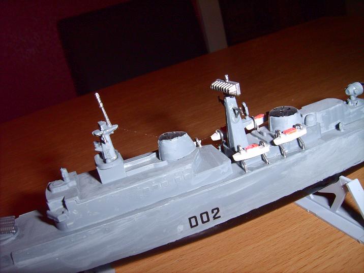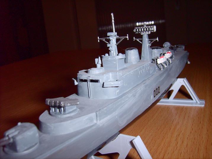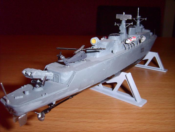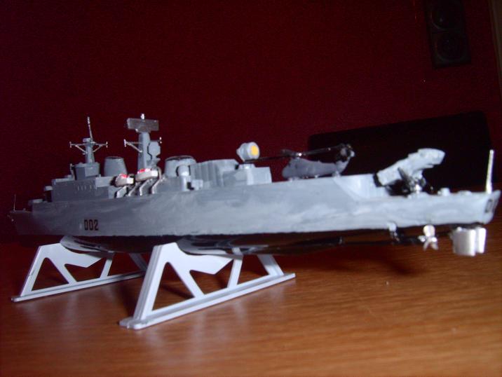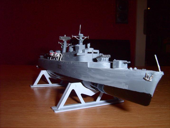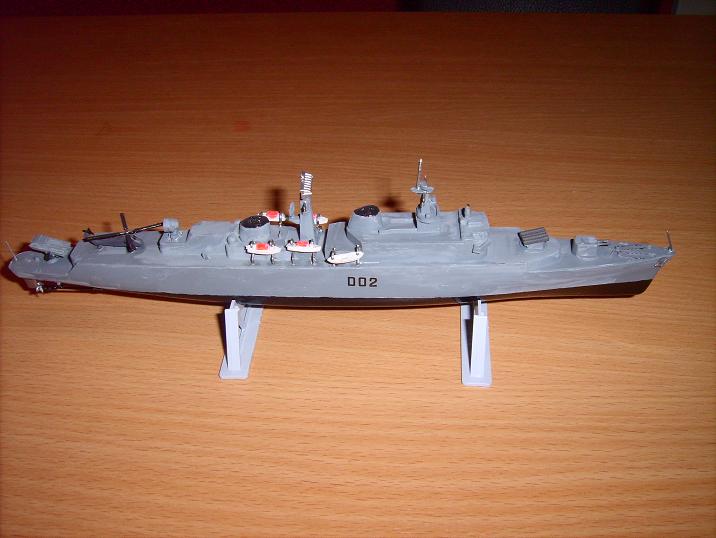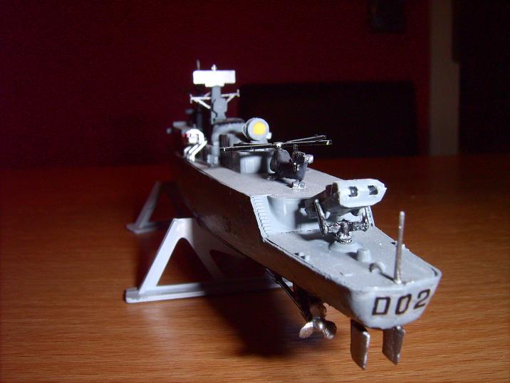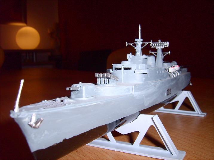 Modell des britischen Zerstörers HMS Devonshire. Dieser Zerstörer spielte im Film Jame Bond 007 Die Welt ist nicht genug mit. Dort wurde er versenkt.