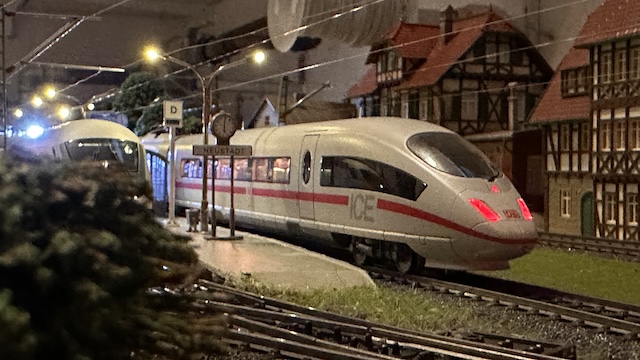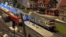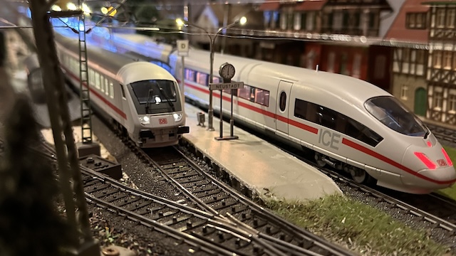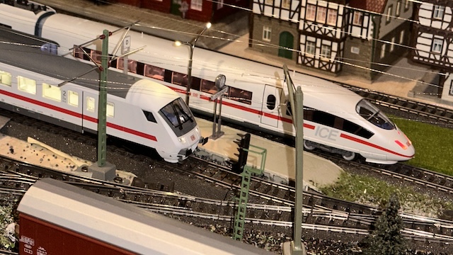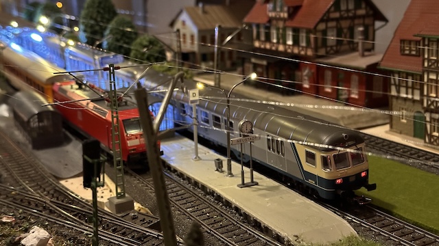 I installed overhead wires. The main line and the train station received overhead lines. This is a sturdy embroidery thread. I think it doesn't look so bulky.